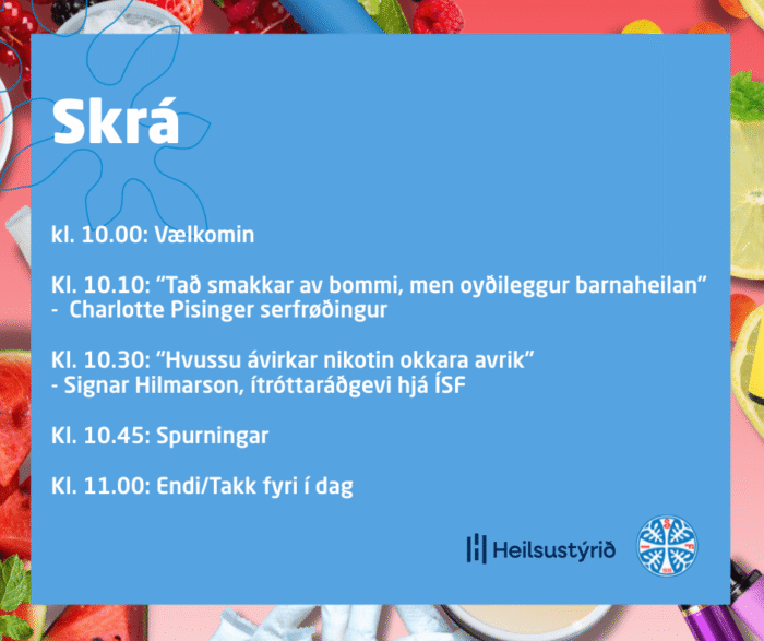 Tí skipa Heilsustýrið og Ítróttasamband Føroya (ÍSF) fyri kunnandi tiltaki fyri skúlanæingum í hádeild um nikotin. Vit ynskja at deila vitan og seta tankar ígongd hjá børnum og vaksnum.